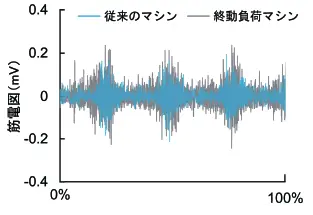 筋電図を用いた解析により、動作に合わせて筋活動が段階的に高まっていく特性が確認されています。無理なく、筋力トレーニングができるため、効率的かつ理論に基づいた筋力アップが期待できます。